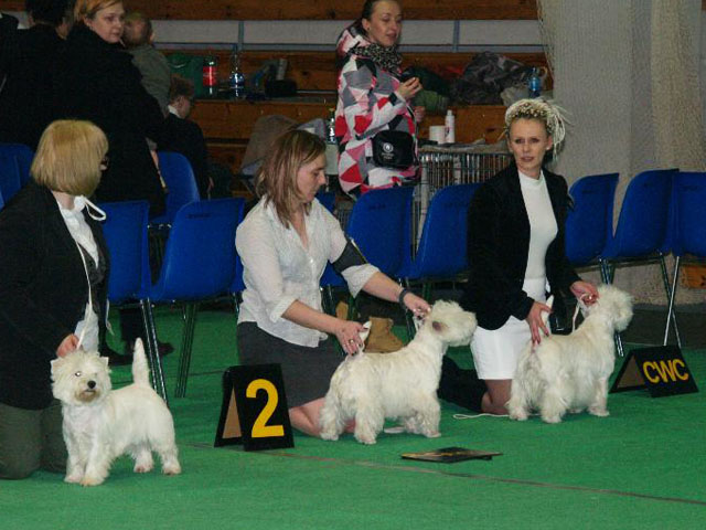 International Dog Show in Rzeszow (Poland). Cairn terrier: Our little NON-IRON GRANDIFLORA Bielanska Sfora in puppy class - very promising, Best Puppy in Breed, IV BIS Puppy. LET'S DANCE TO JOY DIVISION Grandiflora - excellent, Junior Winner. His sister LITTLE MISS PIPE DREAM Grandiflora has got excellent, Junior Winner, Best Junior in Breed and BOB :))) WHWT: TWIGI Połkrza in the intermediate class - 3rd place, excellent. ALL WITHIN MY HANDS IN Grandiflora in open class - excellent, CAC, res.CACIB :))) Judge: Mr Jan Gajewski, judge for BIS Puppy: Mr Iuza Beradze. Great thanks go to our friend and handler Patrycja Smolenska, we also appreciate Matt's help and company a lot. Big thank You :)))